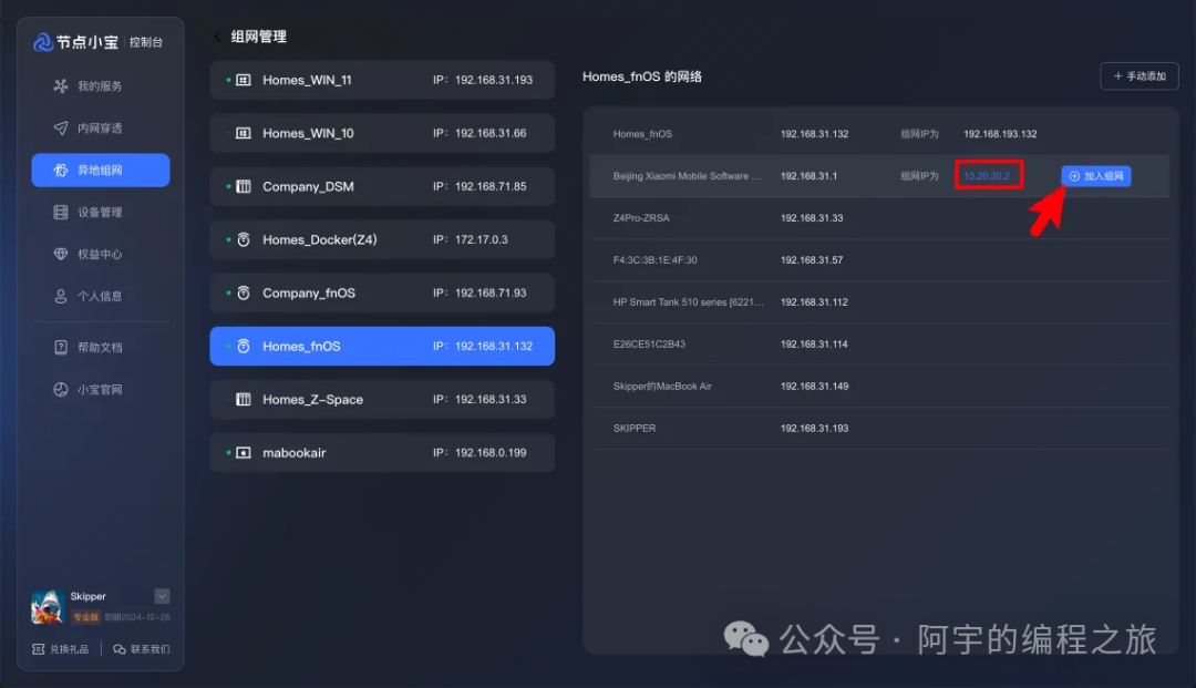 - 我们需要访问家里的小米路由器(192.168.31.1),在右侧可以发现中转设备网络中的其他设备,鼠标悬停至需要访问的设备上,我们可以看到系统为我们预分配了组网IP:10.20.30.2,点击添加即可
