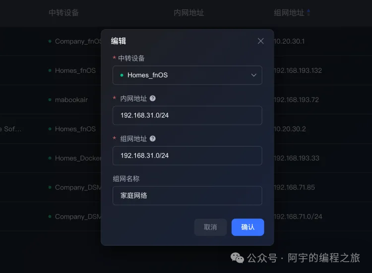 - 通过「手动添加」或「编辑组网」修改内网地址与组网地址为网段,实现网段组网: