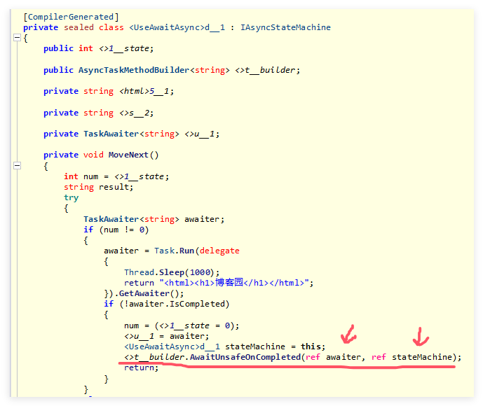 那这段代码在底层是如何运作的呢?刚才也说到了asyncawait只是迷惑你的一种幻象,我们必须手握辟邪宝剑斩开幻象显真身,这里借助 ilspy 截图如下: