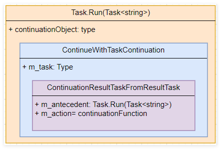 从卦代码看确实没有asyncawait简洁,那 ContinueWith 内部做了什么呢?感兴趣的朋友可以跟踪一下,本质上和 StateMachine 的玩法是一样的,都是借助 m_continuationObject 来实现延续,画个简图如下: