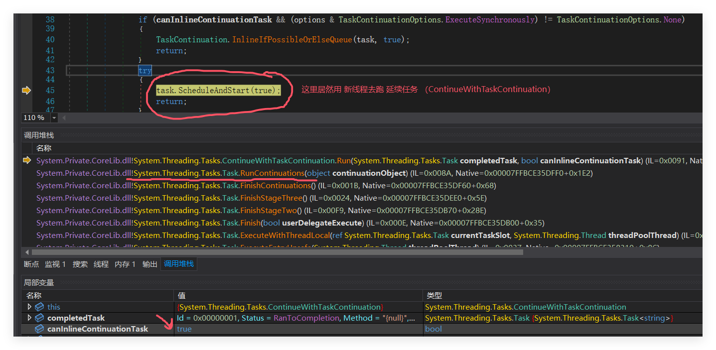 从卦中可以看到,延续任务使用新线程来执行的,并没有一撸到底,这明显与 asyncawait 的方式不同,有些朋友可能又要说了,那如何实现和StateMachine一样的呢?这就需要在 ContinueWith 中新增 ExecuteSynchronously 同步参数,参考如下: