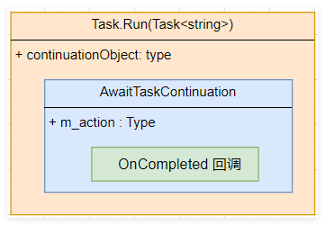 从卦中看,本质上就是借助AsyncTaskMethodBuilder<string> 建造者将 awaiter 和 stateMachine 做了一个绑定,感兴趣的朋友可以追一下 AwaitUnsafeOnCompleted() 方法,最后状态机 <UseAwaitAsync>d__1 实例会放入到 Task.Run 的 m_continuationObject 字段。如果有朋友对流程比较蒙的话,我画了一张简图。
