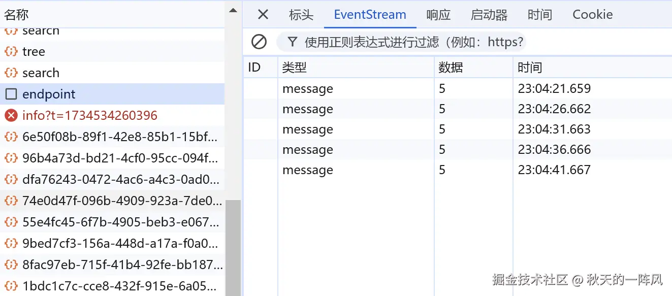 可以看到,客户端只发送了一次http请求,后续所有的返回结果都可以在event.data里面获取,先不谈性能,对于有强迫症的同学是不是一个很大改善呢?