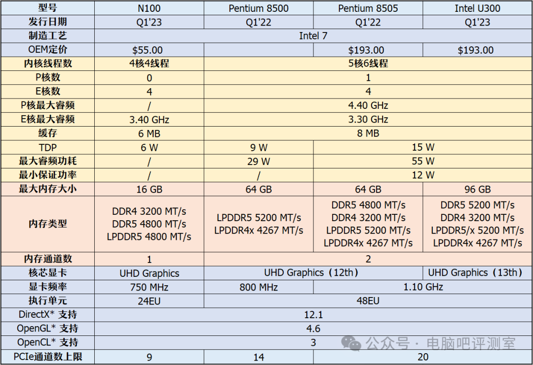 经常有网友问,英特尔N100处理器可以保障我日常的流畅操作吗?答案是:对家庭用户来说,基本不能!除非你的需求真的很低,也就基本的Office办公+简单的工作网页浏览(就是上班族的系列操作),还不能是那种视频直播或者动图很多的网站,否则打开速度肯定很慢。众所周知,N100基于Alder Lake-N架构设计,是个纯4小核处理器(0P+4E),性能也就古董四核i5的水平(比如i5-4430/6400这种,具体测试成绩看下文图片),不过其优点是功耗、发热相对较低(很多机子甚至以TDP=6W调校),适合塞进超小体积设备且长时间开机使用,常见于软路由、视频播放机(电视盒子)中。 为什么说是“相对较低”呢?一个表面功耗不高的CPU性能其实很菜,那么它往往要花很大的力气去完成一件事,运行功耗很容易触及甚至突破标定上限;但一个面上功耗相对高些的CPU性能很强,它只需稍稍使点力就能迅速把任务完成,占用波动甚至都不明显,那么它的真实功耗未必会比前者来得高~如果你对软路由或小主机的性能有一定需求,不希望像N100那样如此羸弱,那么N100的大哥——奔腾8500、奔腾8505以及英特尔U300或许可以纳入考量范畴。 12代以来,英特尔移动版奔腾、赛扬处理器均采用1P+4E的独特设计,其中奔腾的P核还支持超线程技术,因此是5核6线程设计。这三款在运行频率上完全一致,其中奔腾8500和8505都属于12代,intel U300属于13代(因为从13代开始,英特尔取消了奔腾品牌,所以这个intel U300本质上和台式机这个intel 300一样,都是奔腾处理器的继任者),但这个13代无非内存支持频率从DDR5-4800提高至5200,其他几乎都没变,所以没什么意义,除非价格优势很大。三款之中,8505性价比和可操作性权衡最好,可以兼容桌面级DDR4/DDR5内存(自由扩展加装),而不像8500那样必须用LPDDRx焊接内存,并且8505的性能调校比8500更高,核芯显卡性能优势显著,甚至可以流畅运行LOL等主流网游。不管是8505还是U300,它们的CPU-Z跑分中单线程成绩都在710左右,多线程则在2400左右,可以说全面碾压N100。8505、U300的机型并不多见,都应用在小主机或软路由当中。实际我觉得它们用在那种很低端的笔记本里面也不是不能用,至少比N100或者以前的那些古董凌动架构奔腾、赛扬四核厉害很多!性价比较高的一款是拼多多上的智简M4(还有一个炫影P4),其采用英特尔U300处理器(注意,是QS正显测试版),你就把它当做个高清播放机、办公机啥的来看待即可,搭配8GB+256GB的存储配置价格仅需759元,甚至比8505、N100的机型还要来得便宜些。QS正显和正式版没什么区别,一般也不会有BUG。正儿八经的软路由这边,搭配6个2.5Gb网卡口的8505准系统报价一般在900元附近,选配8GB DDR5内存+128GB固态的产品价格大多在1100~1200元区间。这个价格相比AMD锐龙R5-5500U之类的产品还是会略微低一点点。