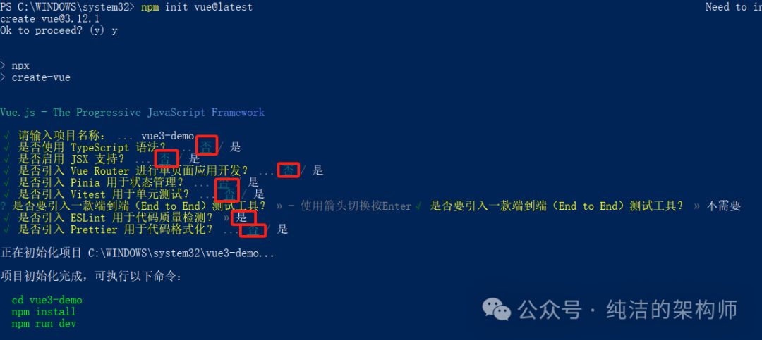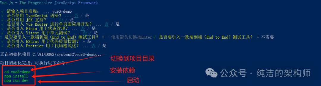 回车后,此时会选择安装项目,这里大部分都是默认“否”,其中有一项“是否引入 ESLint 用于代码质量检测?”,我们通过“左右键/上下键”选择“是”,具体如下截图: