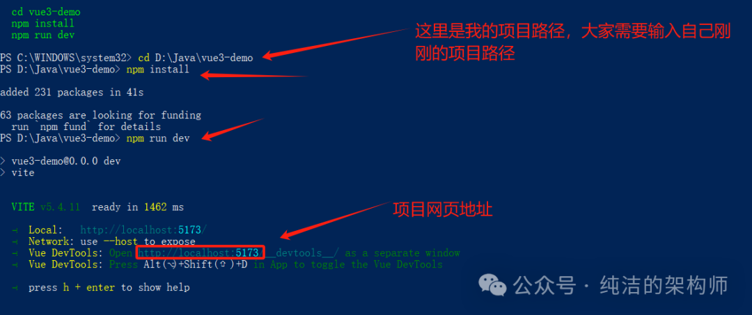 四、启动项目: 接下来我们按照截图最下面的命令,分别输入3个命令进行安装依赖性和启动项目