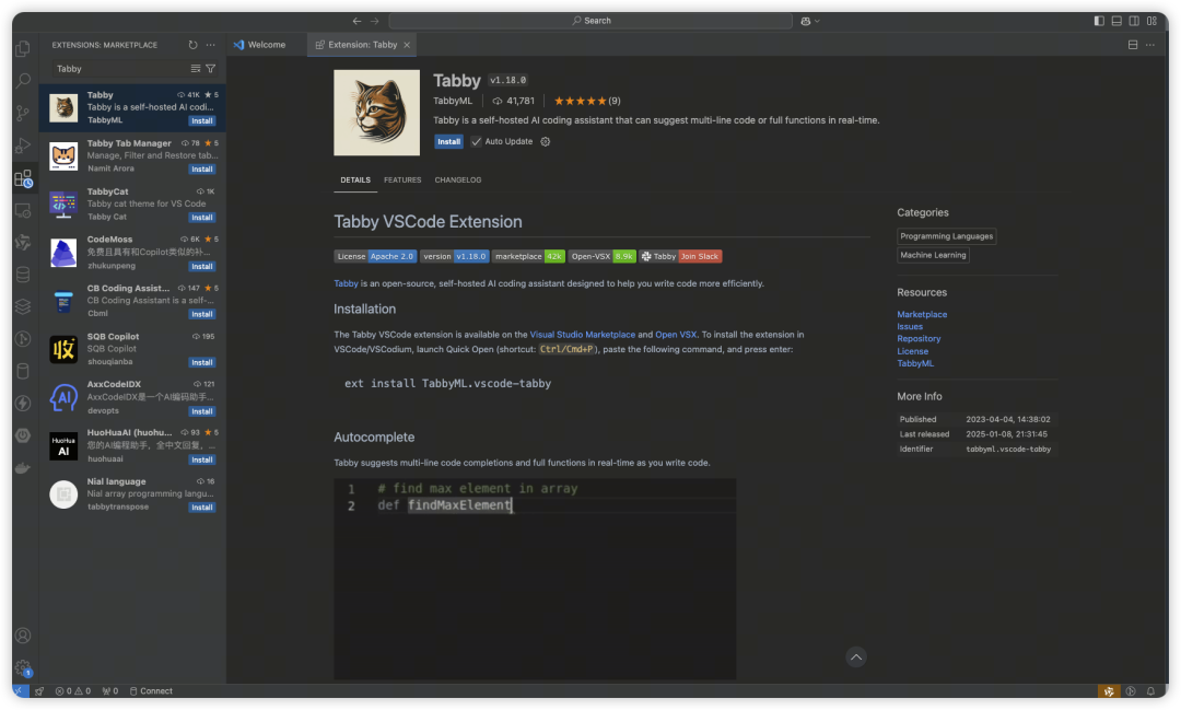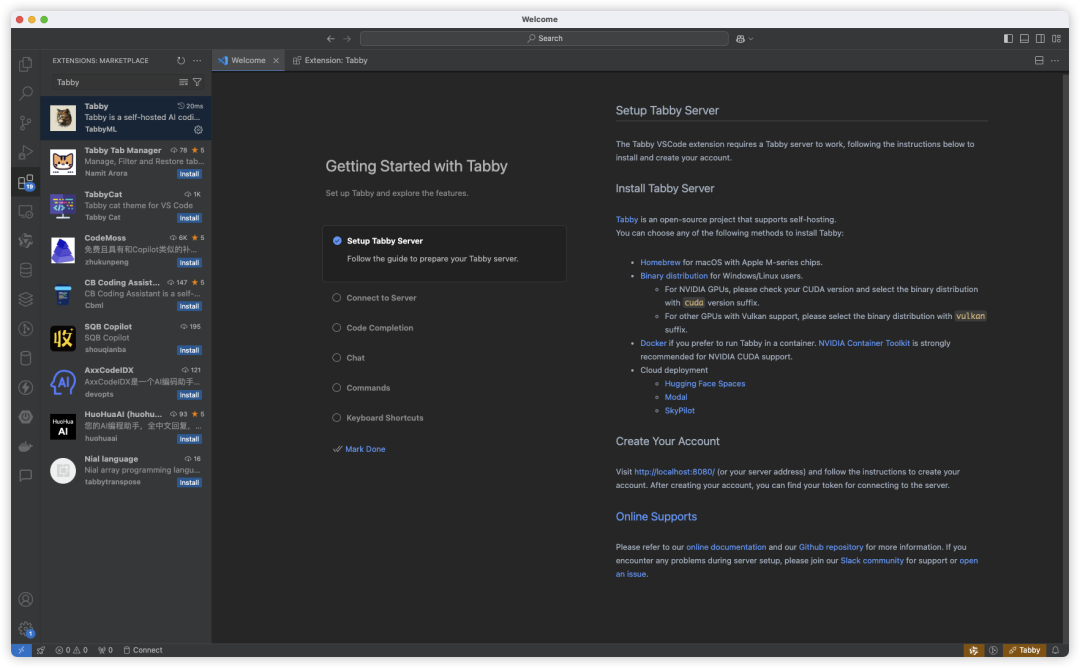 安装文档:https://tabby.tabbyml.com/docs/extensions/installation/vscode/