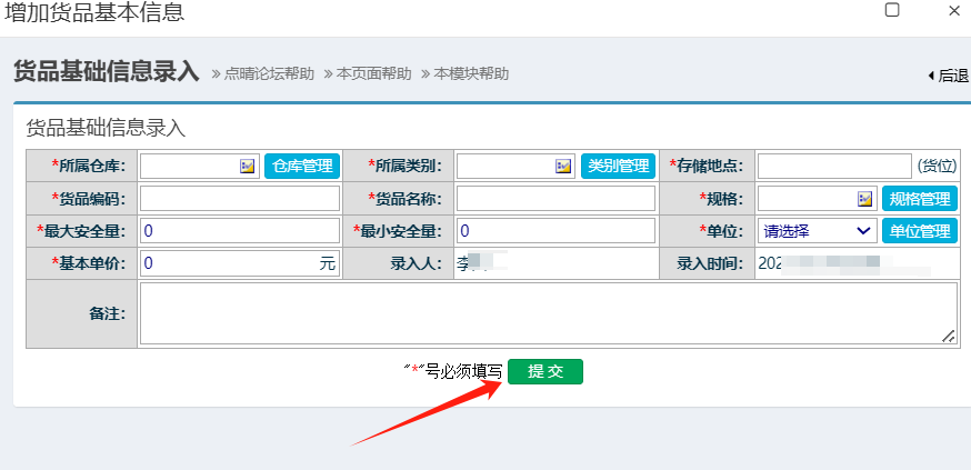 点击货品资料管理,维护按钮 如下图: 点击增加货品按钮 如下图: 填写货品信息,最后点击提交即可 如下图: ![]() 该文章在 2025/1/15 14:32:02 编辑过 |