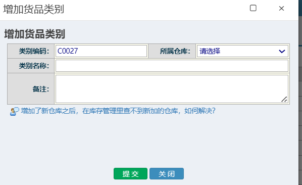 填完类别名称,编码,所属仓库等,最后点击提交即可 如下图: ![]() 该文章在 2025/1/15 14:36:03 编辑过 |