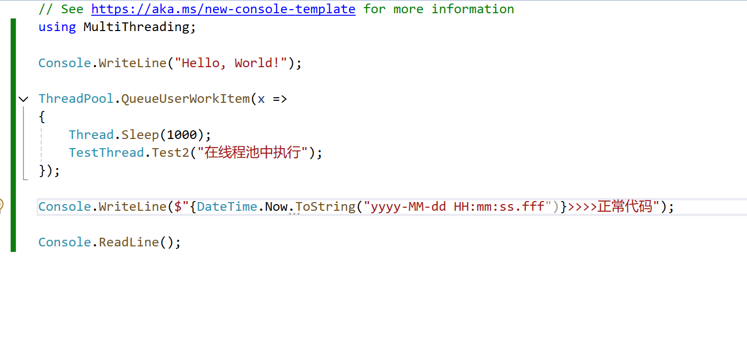 2、WaitCallback也是一个委托,传入需要在线程池内执行的方法名称。以下代码内,“线程池”字符串为要执行方法对应的参数