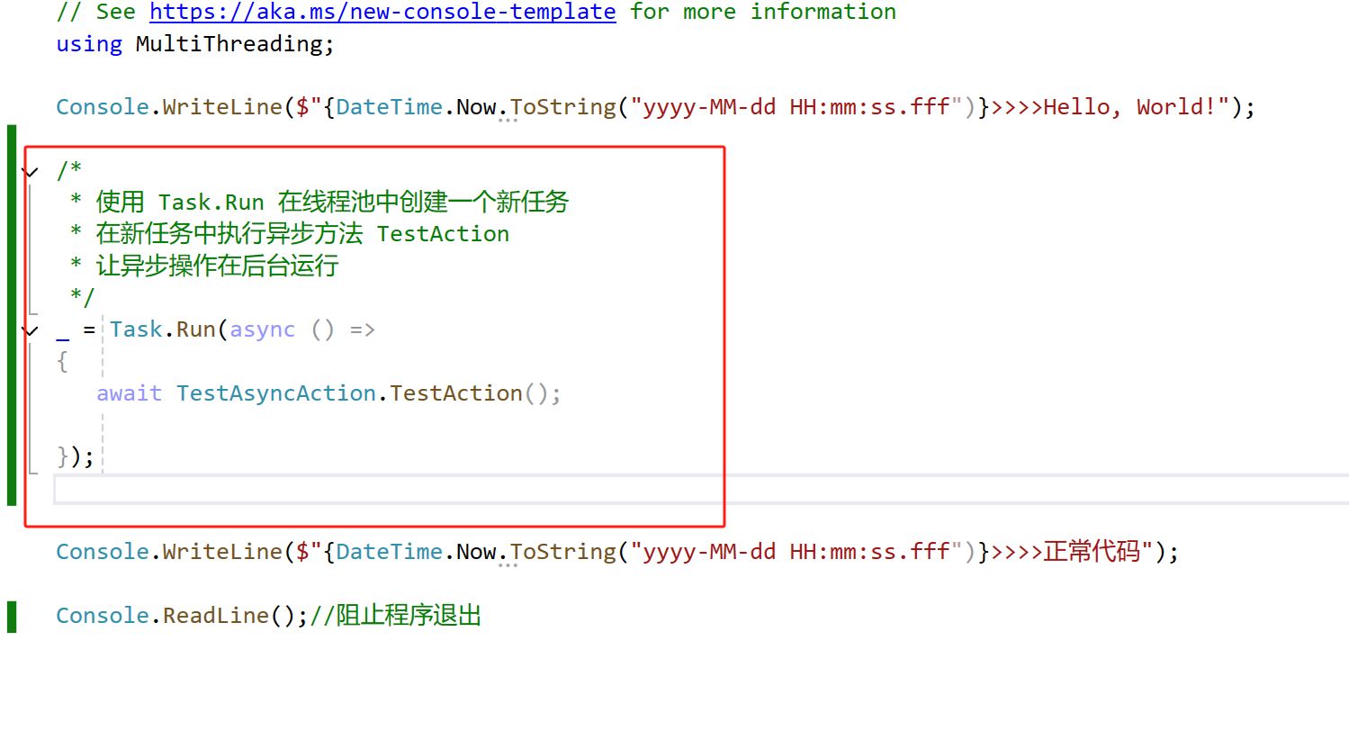 2、使用Task快读创建一个线程。最简单的方法:Task.Run(()=>{ 代码块 })