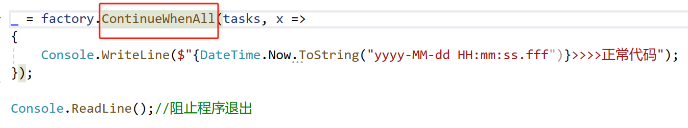 1、【异步结合多线程】如果有多个任务在执行期间,在任意一个线程执行完毕以后进行执行某种操作,可以使用 ContinueWhenAny来进行 查看执行结果: 2、【异步结合多线程】如果要等任务全部执行完毕以后才执行某个代码块,可以使用ContinueWhenAll