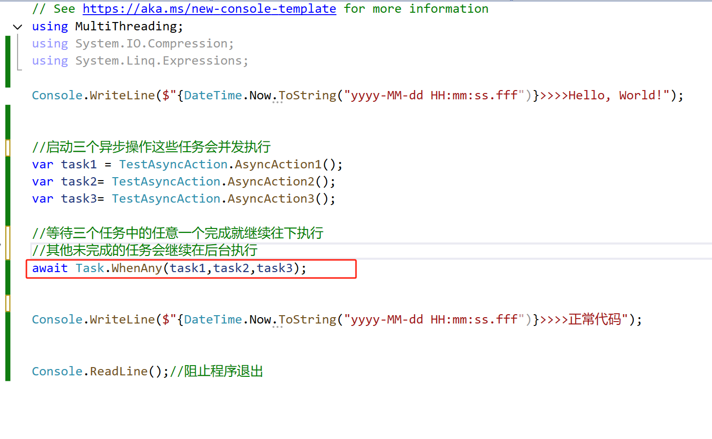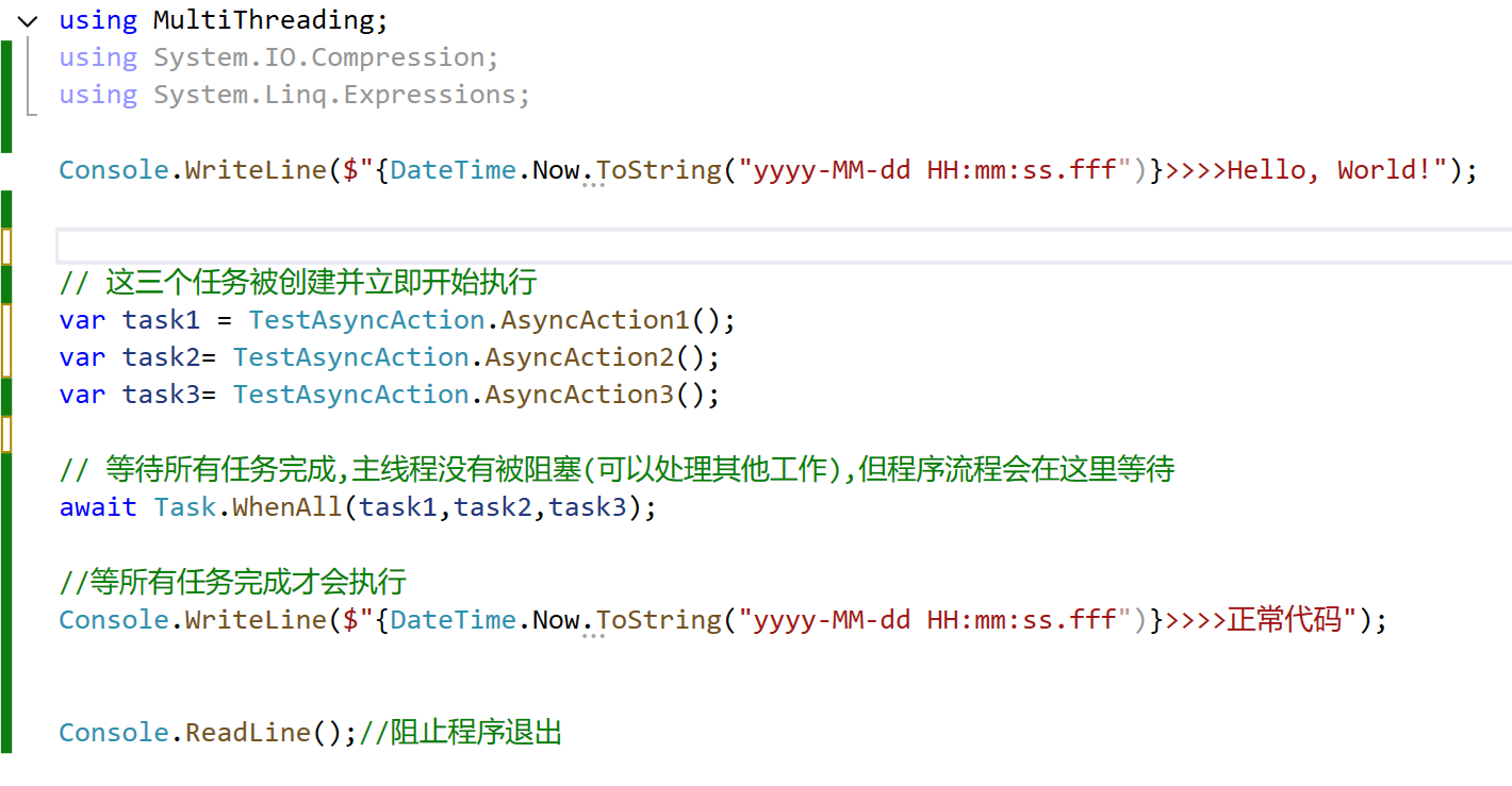 3、异步方法中 使用 WhenAll 和 WhenAny(这个仅模拟纯IO操作,不涉及多线程)