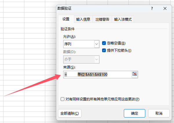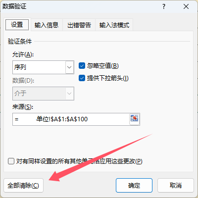 2、在“数据有效性”弹出框,依次点击“全部清除”—“确定”即可。