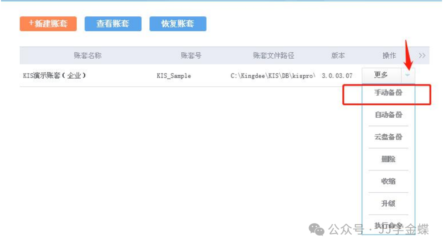 5、金蝶专业版14.1及以后版本的账套备份: 服务器电脑右下角任务栏双击打开【金蝶KIS专业版系统管理】-账套后面-更多-手动备份,如下图所示: