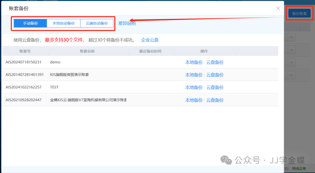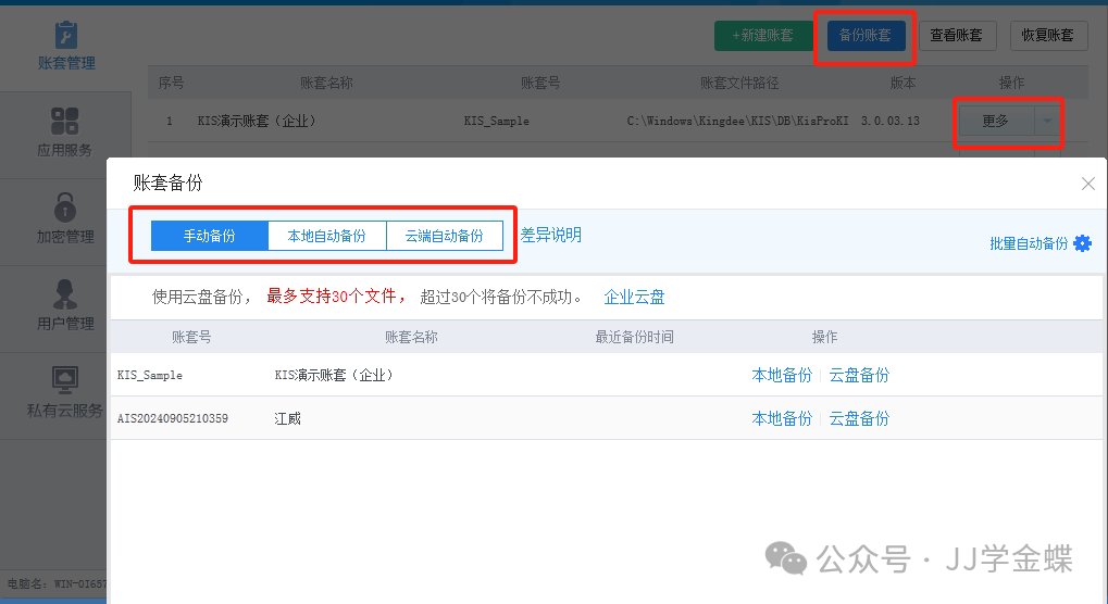 选择备份账套保存位置,建议勾上【备份到企业云盘】,点击【备份】按钮,这样在本地路径和金蝶企业云盘中同时进行备份。 2、金蝶KIS商贸版6.1及先前版本的账套备份: 开始-所有程序-金蝶KIS商贸版-工具-账套管理-备份-选备份路径-确定; 3、商贸版7.0及以后版本的账套备份: 服务器电脑右下角任务栏双击打开【金蝶KIS商贸版系统管理】-账套后面-更多-手动备份-选定备份路径-确定;