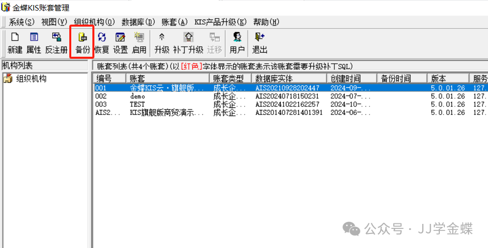3)账套列表中点中需要备份的账套,点工具栏【备份】