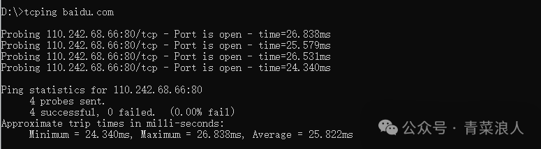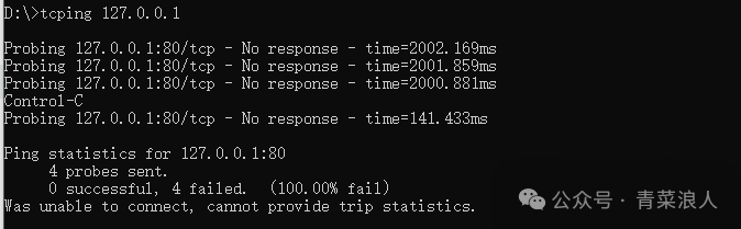 PS:需要注意,tcping 默认使用的目标 80 端口来模拟 ping 测试,如目标未启用 80 端口则会请求失败。
