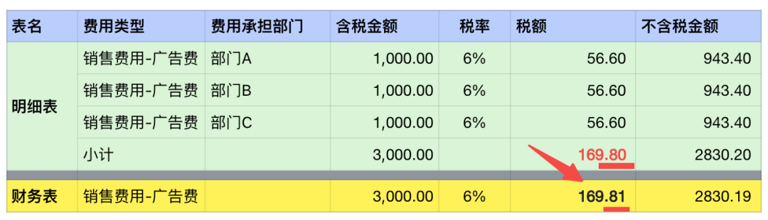 财务核对时,只看应付单《财务表》的税额(汇总)与发票所记载的进项税税额是否一致;但生成凭证时,是用《明细表》的税额(明细)带入到凭证中,如果明细与汇总存在差异,则发票的进项税与凭证(账务)必然出差错!示例如下图:问题原因:财务中台向ERP传《应付单》时,只向明细表传了【含税金额】、【税率】,由ERP自行以四舍五入法分别计算《明细表》和《财务表》的【税额】、【不含税金额】,《明细表》逐行计算,而《财务表》时先将【含税金额】汇总再除以(1+税率)*税率从而计算出【税额】,故二者出差异了!解决思路:实务涉税部分,财务是认票不认账,即以发票为准!所以应付单《明细表》【税额】之和 须等于 《财务表》【税额】之和。解决办法:轧差法,总额减去明细行除最后一条外的合计,求出明细行最一行数金额。因为数据源在OA(费控),流程填报时已填写发票【税额】、【税率】等信息,并上传了发票影印件,那么在对接到财务中台计算应付单明细行的【税额】时,用OA【发票税额】,减去明细行N-1条之和(即除倒数最后1条之外的和),作为第N条的【税额】;传到ERP时,将明细与汇总的【含税金额】、【税率】、【税额】、【不含税金额】均传过去,使发票、中台、ERP三者数据保持一致。事后复盘:涉及财务需求一分一厘都不能差,包括【含税金额】、【税率】、【税额】、【不含税金额】、【数量】,确保链条上、下游均保持一致。
