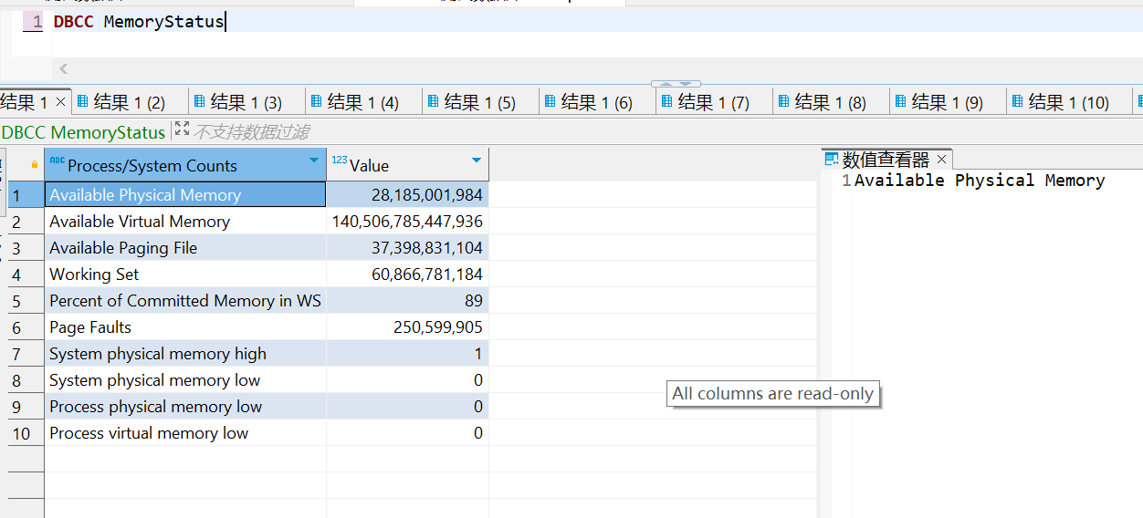 结果集部分重要指标解释(请注意,DBCC MEMORYSTATUS的输出格式和内容可能会随着SQL Server版本的不同而有所变化):对指标不感兴趣,一股脑解决问题可跳过 如下指标查看,直接到下面 缓存清除命令
