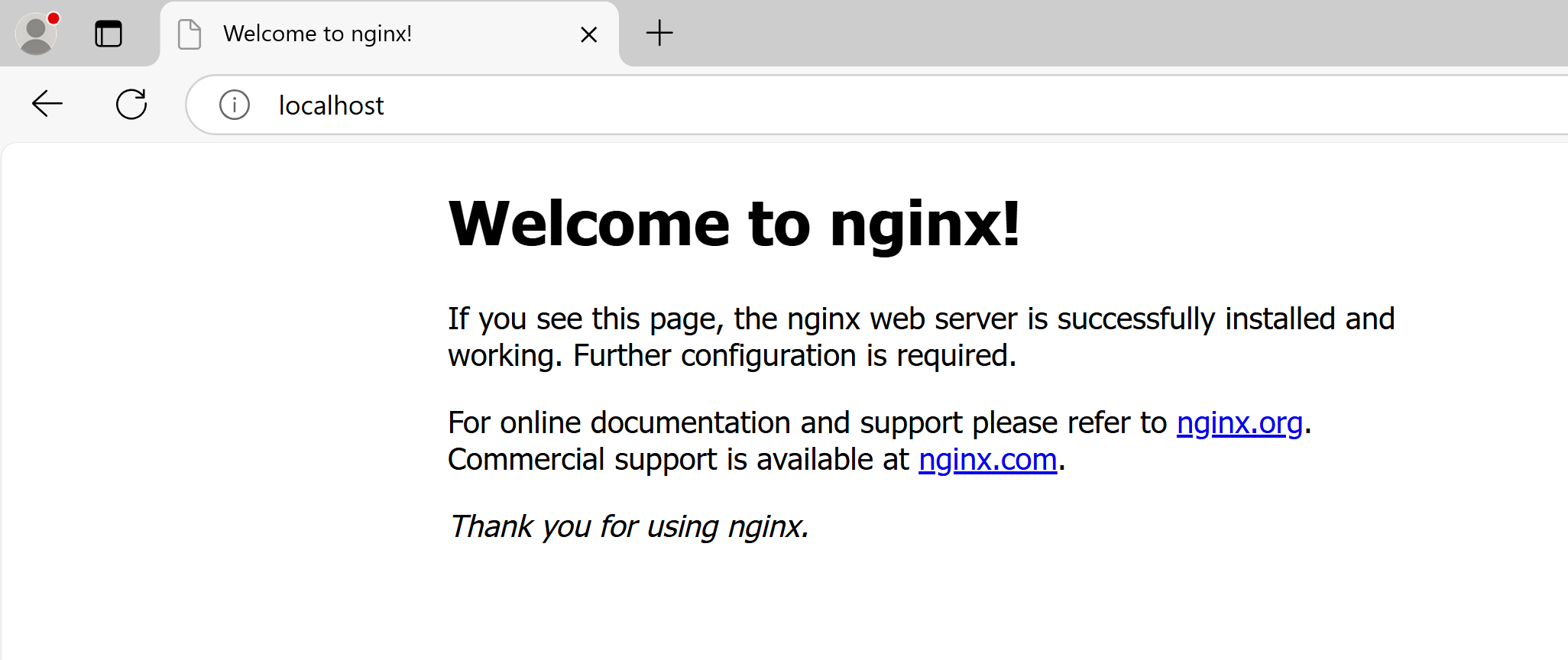 启动成功后,我们访问本机域名 localhost:80 (80 为默认端口,可以省略),就可以看到 Nginx 为我们提供的默认网站了。