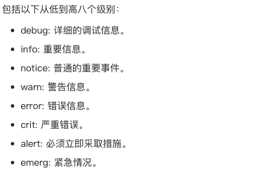 而错误日志仅记录 Nginx 在处理请求时遇到的问题,错误又分为 8 个级别: