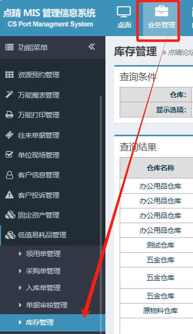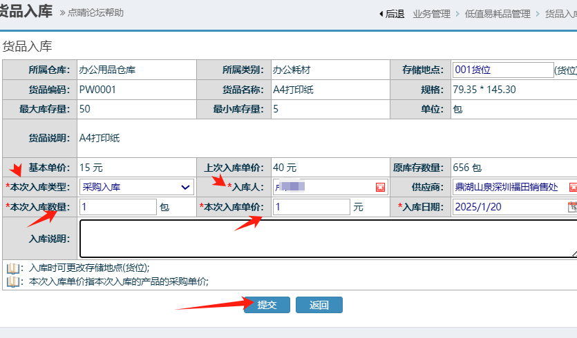 点晴永久免费OA-低耗品管理-货品库存调整入库操作