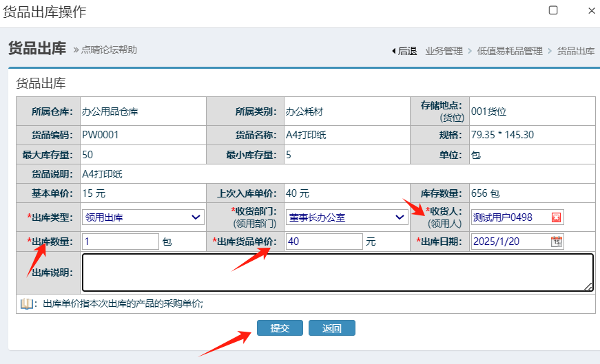 点晴永久免费OA-低耗品管理-货品库存调整出库操作