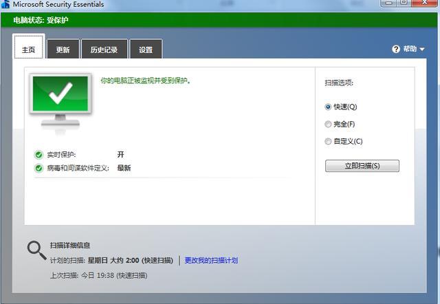 Windows Defender是微软系统自带的杀毒软件,win8以上的版本都自带这款杀毒杀毒软件。如果你希望保护运行较早版本的 Windows 7 的电脑,可以使用 Microsoft Security EssentialsWindows 7环境下推荐Microsoft Security Essentials(也是微软家的)Microsoft Security Essentials 提供备受赞誉的保护功能来防御这些入侵者,而不会给你带来妨碍。Windows 8、Windows RT、Windows 8.1、Windows RT 8.1 和 Windows 10 的 Windows Defender 提供了内置的恶意软件防护功能。你无法使用 Microsoft Security Essentials,但也不需要使用它,因为 Windows Defender 已经包含在系统中并且随时可供使用。下图是windows自带软件界面: