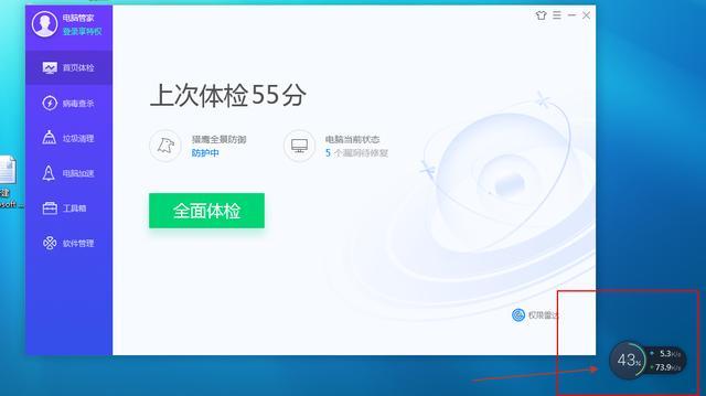 上图箭头所示是电脑管家的一个资源和网络实时显示的悬浮图标,这个很方便,说到这里,就要批评一下微软了,系统自带的 官方软件哪儿也好,但是,就是非要把网速控制等显示藏在任务管理器里,不能实时查看网络使用情况,所以,如果需要检测实时网速的,需要使用国内的软件来进行查看。