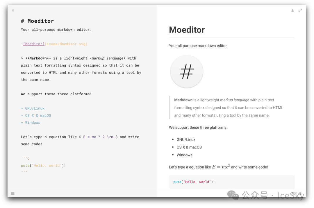 Moeditor 是一款非常简洁的MarkDown 编辑器,支持 Windows、macOS、Linux,基于Electron开发,支持双栏、数学公式、代码高亮、聚焦模式等,唯一的问题是开发者已经停止更新。