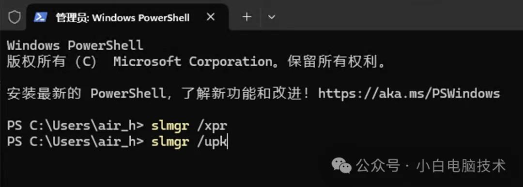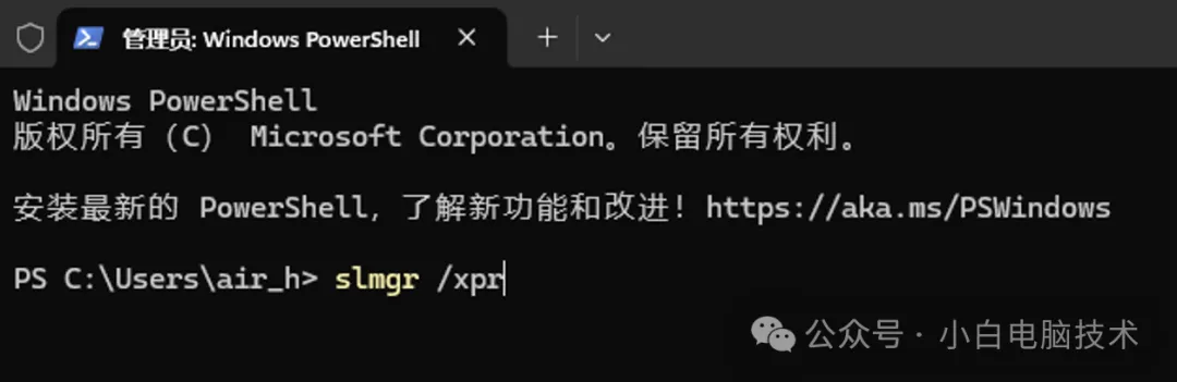 在【Windows PowerShell】或【终端管理员】处输入【slmgr /xpr】
