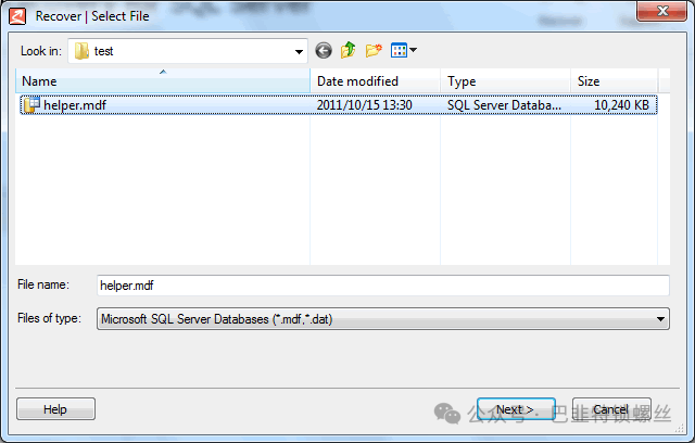 2. 点击菜单中的 File > Recover,选择要恢复的数据库的数据文件(.mdf)