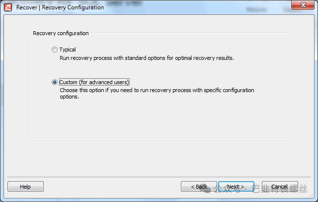 3. Next > Next,进入 Recovery Configuration 界面,选择Custom(选择了Custom才可以选择从日志中恢复误删除的数据)。