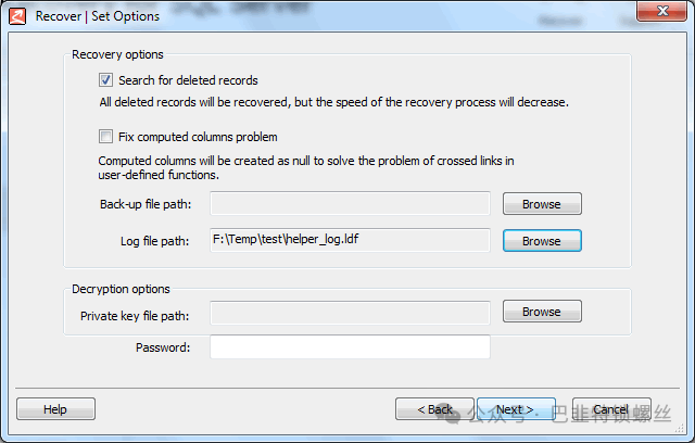 4. Next 进入 Recovery options 窗口,选中 Search for deleted records,并选择要恢复的数据库的日志文件路径(log file path)。