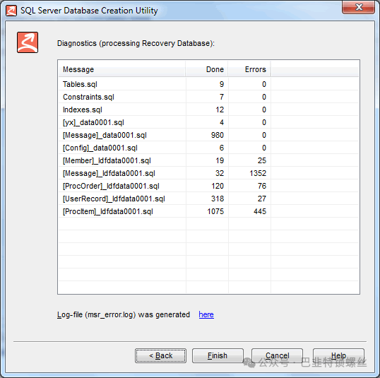 6. 点击Start,开始恢复操作(在上一步选择的目标文件夹中生成相应的SQL文件与Bat文件),然后,出现 SQL Server Database Creation Utility 窗口。