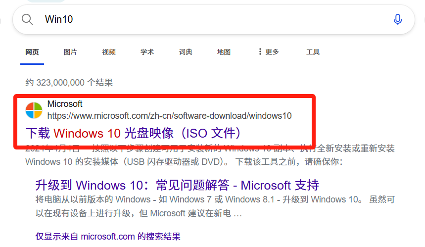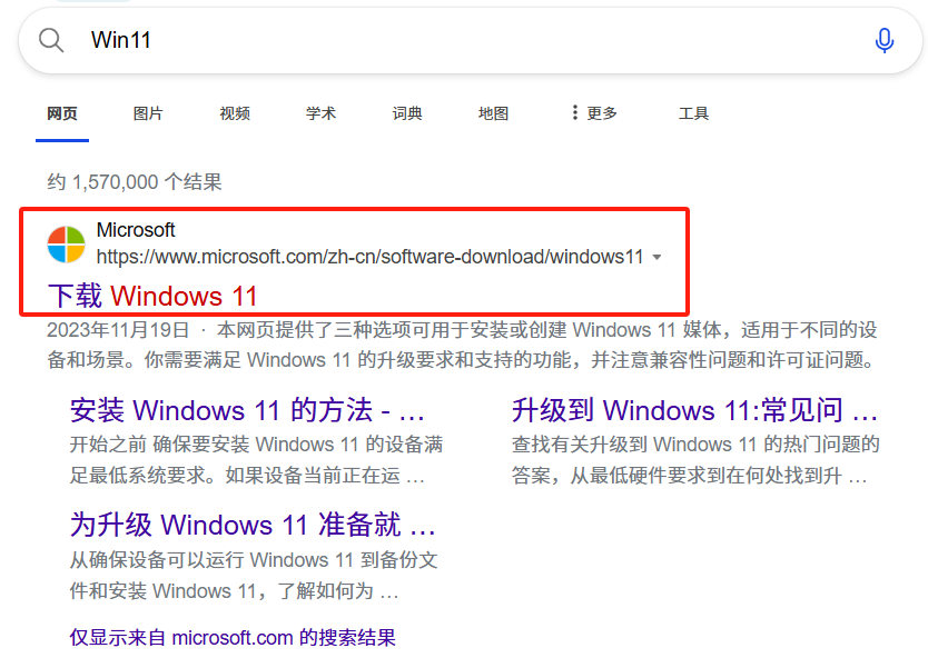 打开浏览器,搜索“Win10”或“Win11”,找到下方图片,点击进入系统下载页面。