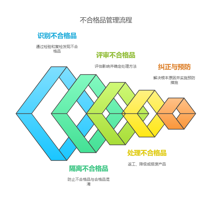 3 不合格品管理流程 1)识别不合格品企业首先需要制定清晰、详细的产品质量标准,涵盖产品的外观、性能、安全性等各个方面。这些标准是识别不合格品的依据,必须具有可操作性和可衡量性。 在生产过程中,要设置多个检验环节,如原材料检验、半成品检验和成品检验。检验人员应依据质量标准,采用科学的检验方法,对产品进行全面、细致的检查。对于发现的疑似不合格品,要进行复检,确保判断的准确性。同时,检验设备的精度和准确性也至关重要,企业应定期对设备进行校准和维护。 2)隔离不合格品一旦确认产品不合格,应立即采取隔离措施,防止其与其他合格品混淆。 可以设立专门的不合格品区域或使用标识明显的容器进行存放。在隔离过程中,要详细记录不合格品的批次、数量、发现时间、发现地点等信息,为后续的处理提供依据。 3)评审不合格品评审团队应由质量管理部门、生产部门、技术部门等相关人员组成。质量管理部门负责从质量标准的角度进行评估;生产部门了解生产过程中的实际情况,能够提供关于不合格品产生的可能环节和原因的信息;技术部门则从技术改进的角度出发,为处理不合格品提出专业建议。 评审团队要对不合格品进行综合分析,评估其对产品功能、性能和安全性的影响程度。根据影响程度的不同,确定不合格品的处理方式。 4)处理不合格品对于可以通过简单修复达到质量标准的不合格品,可以选择返工或返修。返工是指将产品重新投入到生产流程中,按照正常的工艺流程进行加工,使其符合质量要求。返修则是针对产品存在的特定问题,采取针对性的修复措施。例如:对于因焊接不良导致接触不良的电子元件,可以通过重新焊接进行返修。 当不合格品无法完全修复到原定质量标准,但仍然具备一定的使用价值时,可以考虑降级使用。降级使用的产品应在包装和说明中明确标注其质量等级和适用范围,确保消费者能够正确使用。 例如:一些因颜色偏差较大的纺织品,可以降级用于制作对颜色要求不高的劳保用品。 对于无法修复且无使用价值的不合格品,必须进行报废处理。报废过程要符合环保要求,避免对环境造成污染。同时,要对报废的不合格品进行登记和统计,分析其产生的原因,以便在今后的生产中加以防范。 例如:对于含有有害物质的不合格化工产品,要严格按照危险废物处理规定进行销毁。 5)纠正与预防措施针对已发生的不合格品问题,要深入分析其产生的根本原因。是原材料质量问题,还是生产过程中的操作失误,亦或是设备故障?找到原因后,立即采取纠正措施,消除问题源头。 在纠正问题的同时,更要注重预防措施的制定和实施。通过总结经验教训,完善生产流程、加强员工培训、优化质量检验体系等,预防类似不合格品的再次出现。