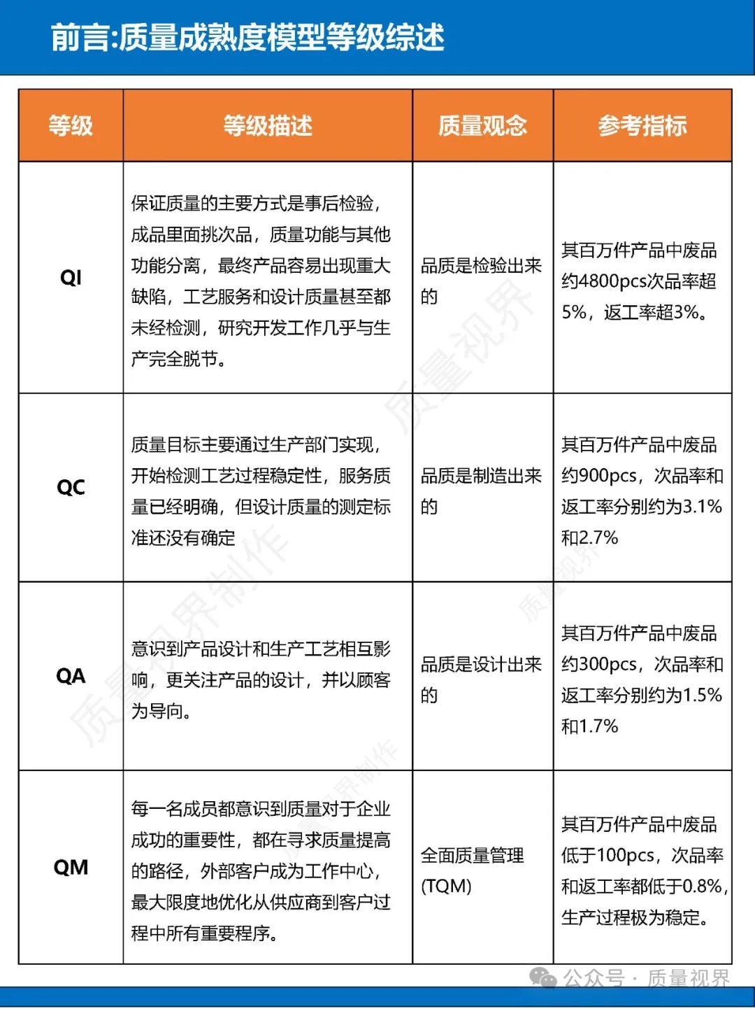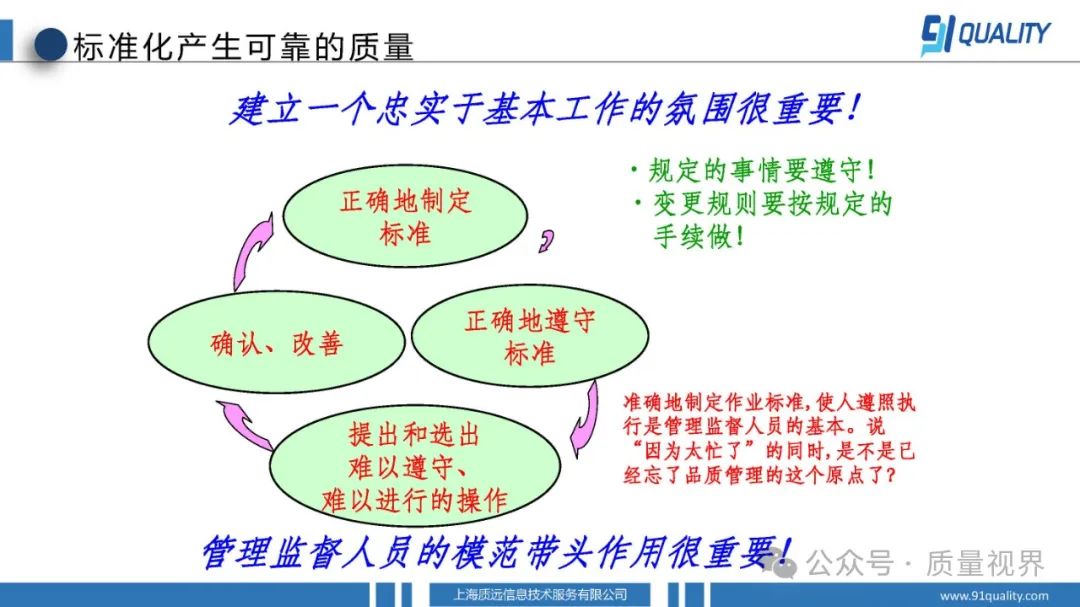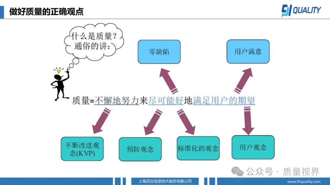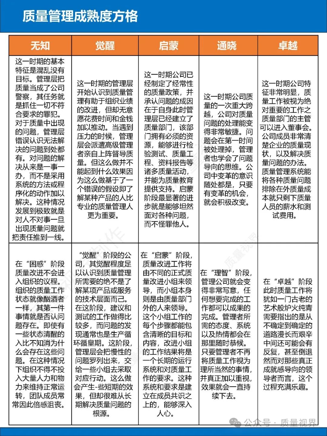 在当今竞争激烈、市场环境瞬息万变的商业版图中,产品与服务质量宛如企业的生命线,牢牢把控着企业兴衰存亡的命脉。而处于质量管理核心位置的质量人,肩负着保障质量水准、推动质量提升的重任,在这场质量捍卫战里,系统思维成为其不可或缺的 “秘密武器”。本文介绍质量管理4个等级、7大原则、10个基本思维方式、12个步骤、15个基本原理,每一条都是管理精髓。 01 质量的4个等级 02 质量管理的7大原则 质量管理的七大原则是以顾客为关注焦点、领导作用、全员参与、过程方法、改进、循证决策、关系管理 ,以下是对这些原则的详细阐述: 1、以顾客为关注焦点:深入了解顾客需求,包括潜在需求。例如苹果公司通过不断创新产品功能和提升用户体验,满足了消费者对于便捷、高效和高品质电子产品的需求。确保组织的目标与顾客需求和期望相结合,将顾客满意度作为衡量工作成效的重要指标。 2、领导作用:领导者要为组织制定清晰的质量方针和质量目标,指明发展方向。如华为的任正非提出了 “以客户为中心,以奋斗者为本” 的核心价值观,引领华为在全球通信和科技领域取得巨大成功。 3、全员参与:为员工提供必要的培训和资源,使他们具备相应的能力和知识,以胜任质量管理工作。比如一些制造企业会定期组织员工参加生产技能和质量管理培训课程。建立激励机制,鼓励员工积极参与质量改进活动,对表现优秀的员工给予奖励和认可。 4、过程方法:识别和确定组织内的关键过程,例如产品设计开发过程、生产制造过程、售后服务过程等。对每个过程进行策划、实施、检查和改进,即 PDCA 循环,确保过程的有效性和效率。丰田公司的生产过程管理就是过程方法的优秀典范,通过不断优化生产流程,实现了高质量和高效率的生产。 5、改进:建立持续改进的机制和文化,鼓励员工发现问题并及时提出改进建议。如海尔集团的 “日清日高” 管理模式,要求员工每天对工作进行总结和改进。运用各种质量管理工具和方法,如六西格玛、精益生产等,对组织的产品、服务和管理过程进行持续改进。 6、循证决策:收集和分析与质量管理相关的数据和信息,包括顾客反馈、生产数据、质量检测数据等。例如电商企业通过分析大量的顾客评价数据,来改进产品和服务质量。 7、关系管理:识别组织的相关方,包括供应商、合作伙伴、顾客、员工等,并建立良好的沟通和合作关系。 03 质量管理的10个基本思维方式 04 质量管理体系建立和实施的12个步骤 05 质量管理的15个基本原理 阅读原文:原文链接 点晴模切ERP更多信息:http://moqie.clicksun.cn,联系电话:4001861886 该文章在 2025/1/23 9:24:29 编辑过 |