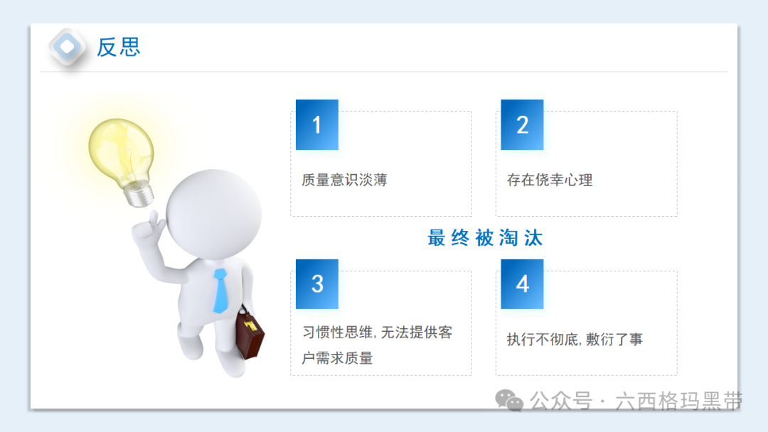 质量意识缺乏的案例让我们来看一些质量意识缺乏的案例。案例1、案例2、案例3、案例4和案例5,这些案例都反映了我们在工作中可能遇到的一些问题。比如,小小的错误被忽视,最终导致小事变大事;原物料屡屡领错,反映出我们的管理存在漏洞;对工作要求理解不清,盲目操作,等等。这些案例给我们敲响了警钟,我们必须从中吸取教训,避免类似问题的发生。 案例1:小小的错误被忽视在一个电子产品的生产线上,工人在装配过程中发现了一个小小的螺丝没有拧紧,但认为这是一个小问题,没有及时处理。结果,这个产品在客户使用过程中出现了故障,导致客户对我们的产品失去了信任。这个案例告诉我们,小小的错误如果不及时处理,可能会引发严重的后果。 案例2:原物料屡屡领错在另一个生产线上,工人多次领错了原材料,导致生产过程中断,延误了交货时间。经过调查发现,这是由于原材料管理混乱,标识不清导致的。这个案例反映了我们的管理存在漏洞,我们需要加强原材料管理,确保每一种原材料都有清晰的标识和严格的领用制度。 案例3:对工作要求理解不清在一个软件开发项目中,开发人员对客户需求理解不清,盲目开发,结果开发出的产品与客户的需求相差甚远,导致项目失败。这个案例告诉我们,我们必须与客户保持密切沟通,确保对客户需求有准确的理解,避免盲目操作。 质量意识观念分享在质量观念方面,我们常常存在一些错误的认识。比如,认为质量是各人自扫门前雪,莫管他人瓦上霜;认为质量差不多就可以了;认为质量只牵涉到有形的事务,等等。然而,正确的质量观念应该是:品质不是检查出来的,是设计出的,生产出来的,预防出来的,习惯出来的,是以客户的满意度为依归的;质量是价值与尊严的起点,是企业赖以生存的命脉;质量的标准是由市场、客户来决定的;质量是环环相扣的过程;质量就是符合顾客的需求;质量看得见,过程是关键;第一次就做好,一开始就符合要求;零缺陷,100%是可以完全达到的;没有好的品质,公司明天可能就要破产,我明天可能就要失业;你的下一道工序就是你的市场,下一道工序是用户;品质没有折扣,品质就是按照客户的要求不折不扣的执行;品质的提升不能一蹴而就,必须通过持续改进而达到。 正确的质量观念