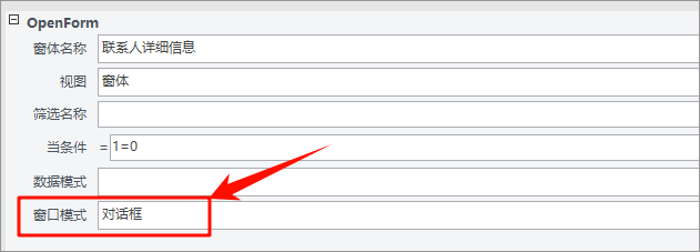 另一种方式动态设置,在使用OpenForm宏操作(或VBA命令DoCmd.OpenForm),“窗体模式”设置为“对话框”,就能将窗体在打开时动态改变窗体模式。这种方法最常使用,它会忽视原窗体“模式”、“弹出方式”属性的设置