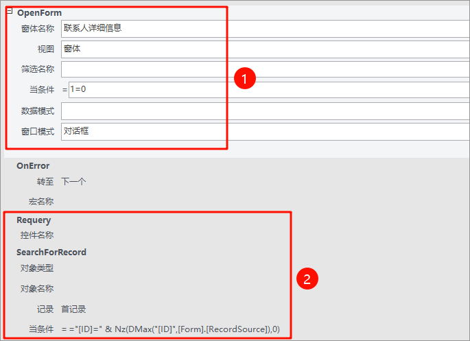DoCmd.OpenForm "联系人详细信息", acNormal, "", "1=0", , acDialog
