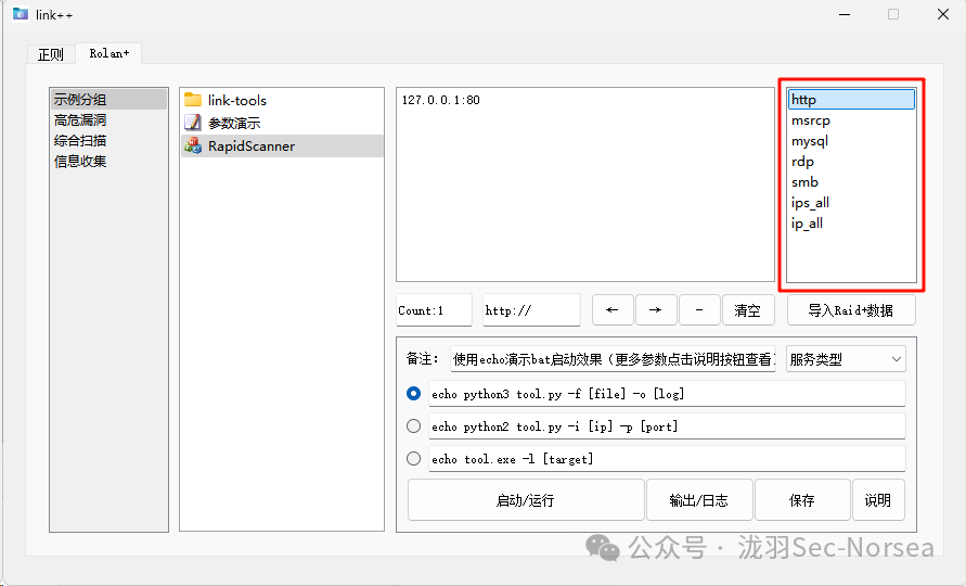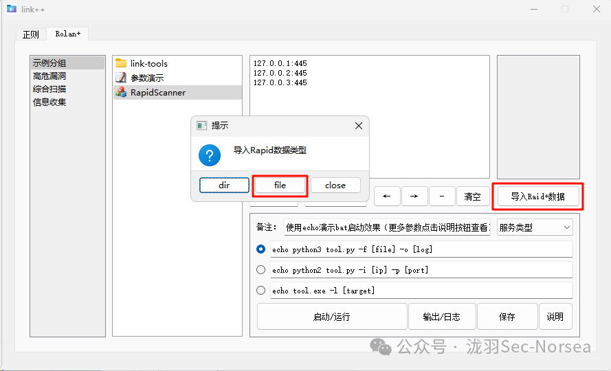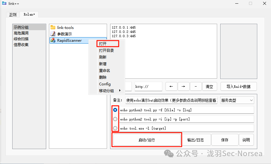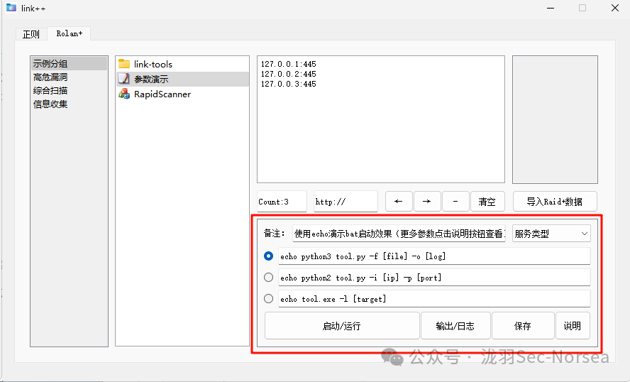 支持拖拉新增工具(脚本、文件夹),支持自定义运行参数和备注,支持bat批量运行脚本,支持RapidScanner端口扫描结果服务指纹联动工具,可协助安全运维人员快速运行工具(脚本、文件夹),提高安全检测效率。