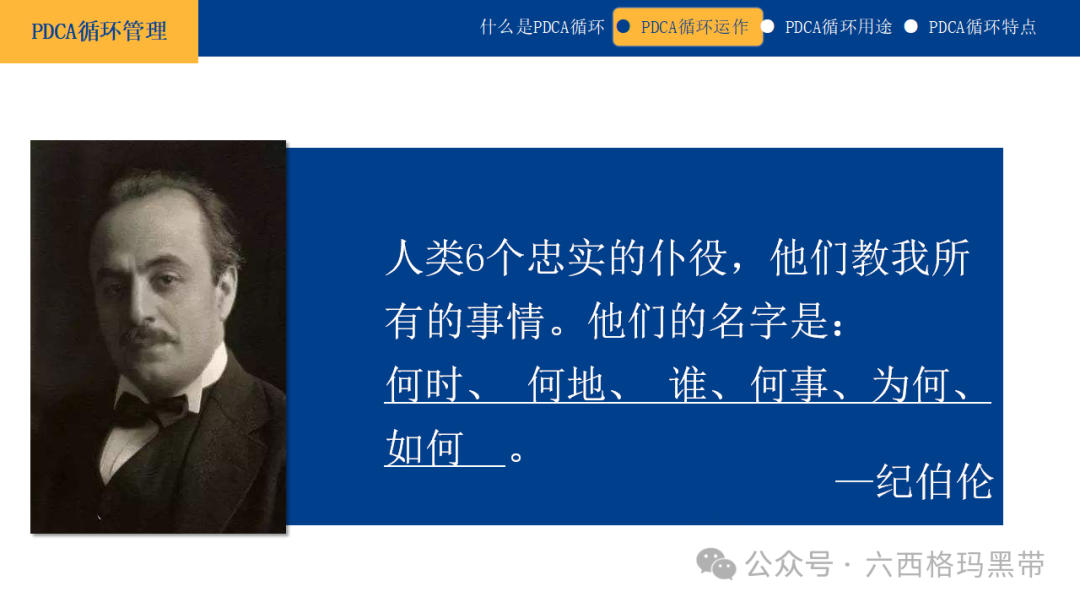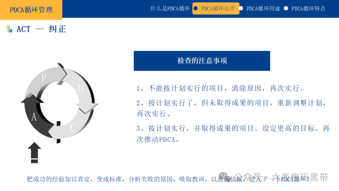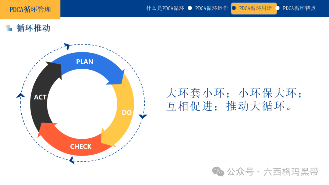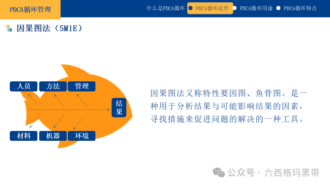 通过5W1H法的系统思考,我们能够更加全面地理解问题,制定出更加有效的解决方案。 因果图法(鱼骨图)因果图法,又称鱼骨图法,是一种用于分析结果与影响因素之间关系的工具。它通过将问题的主要原因(即“鱼头”)和次要原因(即“鱼骨”)以图形化的方式呈现出来,帮助我们直观地识别问题的根源,并找到解决问题的措施。鱼骨图法常用于质量管理、故障分析、项目管理等领域,是PDCA循环中检查阶段的重要工具之一。 PDCA循环的特点PDCA循环作为一种科学的管理方法,具有以下几个显著的特点: 大环套小环PDCA循环是一个层级结构,大循环中可以包含多个小循环。每个小循环都是一个完整的PDCA过程,它们相互独立,但又服务于大循环的目标。这种层级结构使得PDCA循环能够灵活地应用于不同层级的管理活动中,从组织战略到具体任务,都可以找到合适的循环层级。 小环保大环在PDCA循环中,小循环的成功是实现大循环目标的基础。每个小循环都应对其所在的大循环负责,确保其活动与大循环的目标保持一致。通过不断地优化小循环,可以推动大循环的持续改进和提升。 互相促进PDCA循环的各个阶段不是孤立的,而是相互关联、相互促进的。计划阶段为执行阶段提供了方向和依据;执行阶段将计划转化为实际行动;检查阶段对执行结果进行评估和反馈;修正阶段则根据反馈对计划进行调整和优化。这四个阶段形成一个闭环系统,共同推动组织的持续改进和发展。 推动大循环PDCA循环的最终目的是通过不断的迭代和改进,推动整个组织或项目的大循环向前发展。每一个小循环的完成,都是对大循环目标的一次逼近。随着PDCA循环的不断进行,组织能够逐步积累经验,优化流程,提升能力,最终实现战略目标和持续发展。 阅读原文:原文链接 该文章在 2025/1/24 9:10:32 编辑过 |