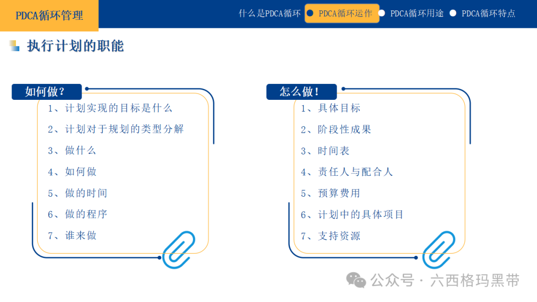 对于改善性计划,可以结合鱼骨图法(因果图法)来进一步分析问题的根源,并制定相应的改善措施。 实施方案及时间计划中的实施方案应具有可操作性和连贯性。可以将大计划分解为若干个小计划或阶段性目标,但每个小计划之间应有逻辑上的联系,共同支撑大计划的实现。同时,应明确每个阶段的时间安排,确保计划能够按时完成。 应有数据可衡量及成果评估计划应包含可量化的指标和成果评估方法。这不仅能够帮助我们在执行过程中跟踪进度,还能在计划结束后对成果进行客观评价。数据化的管理是现代企业管理的重要趋势,它能够使管理更加精准、高效。 思考方法5W1H法5W1H法是一种基本的思考问题和解决问题的方法,它涵盖了问题解决的六个关键方面:
