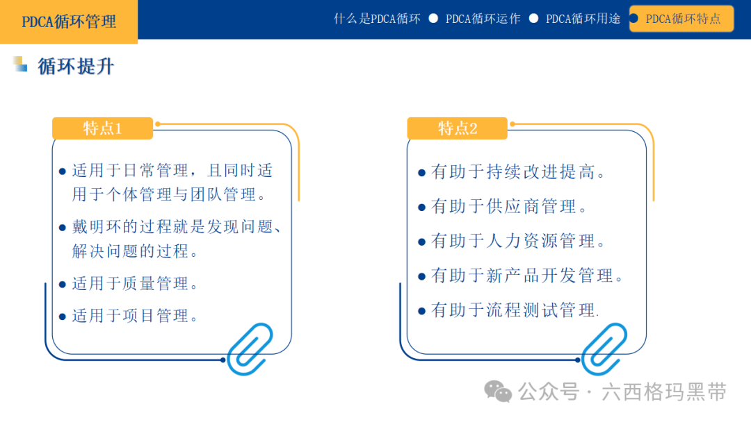 PDCA循环的实践价值持续改进的文化PDCA循环不仅仅是一种管理工具,它更是一种促进组织内部形成持续改进文化的驱动力。通过不断地计划、执行、检查和修正,组织能够培养出一种对现状永不满足、对未来持续探索的态度,鼓励员工主动发现问题、提出改进意见,从而形成一种积极向上的工作氛围。 增强应变能力在快速变化的市场环境中,PDCA循环帮助组织增强了对外部变化的敏感度和响应速度。通过定期的评估和修正,组织能够迅速调整策略,适应新的市场需求或应对突发状况,确保在竞争激烈的环境中保持领先地位。 促进团队协作PDCA循环的实施需要跨部门、跨职能的紧密合作。在计划阶段,团队成员共同参与目标设定和方案制定;在执行阶段,各自承担责任,协同工作;在检查和修正阶段,共同分析成果,分享经验教训。这一过程不仅加强了团队成员之间的沟通与协作,还促进了知识共享和团队凝聚力的提升。 提升决策质量PDCA循环强调基于数据和事实的决策。通过系统的数据收集、分析和反馈,管理者能够更加准确地了解实际情况,做出更加科学、合理的决策。同时,循环过程中的持续学习和经验积累,也为未来的决策提供了宝贵的参考依据。 实现战略目标将PDCA循环应用于战略层面,可以帮助组织将长期愿景分解为短期可实现的目标,并通过持续的循环迭代,逐步逼近并最终实现战略目标。这一过程不仅确保了战略的有效落地,还促进了组织能力的持续提升,为长期发展奠定坚实基础。 做计划的注意事项在PDCA循环中,计划阶段是整个循环的基石,一个周密的计划能够为后续的执行、检查和修正提供清晰的方向和坚实的基础。因此,在制定计划时,需要特别注意以下几个方面: 认清目的首先,必须明确计划的目的,这是计划制定的出发点和归宿。计划项目应紧密围绕组织或个人的长期目标展开,确保每一项计划都是对实现这些目标的有效支撑。同时,计划目标应具体、可量化,以便于后续的跟踪和评估。 充分掌握相关事项在制定计划之前,需要对现状进行全面、深入的分析。这包括了解组织内部的资源状况、能力水平,以及外部环境的机遇与挑战。只有充分掌握相关事项,才能制定出既符合实际又具有前瞻性的计划。 以5W2H法思考5W2H法是一种有效的思考工具,它帮助我们从多个维度审视计划,确保其完整性和可行性。具体来说,就是回答以下问题: