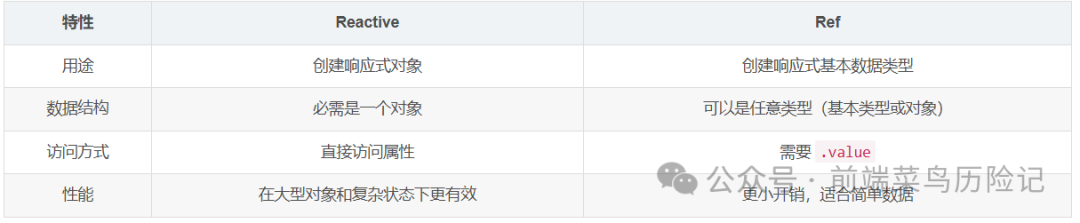 :主要用于对象类型,对于基本数据类型,虽然也可以使用reactive(如reactive({ value: 1})),但不如ref方便。并且reactive对象的属性可以直接访问,不需要额外的语法,如