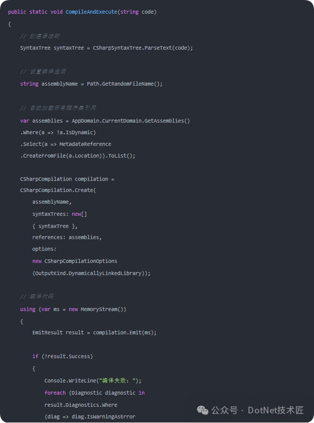 Roslyn 提供了完整的编译器功能,支持动态编译和代码分析。