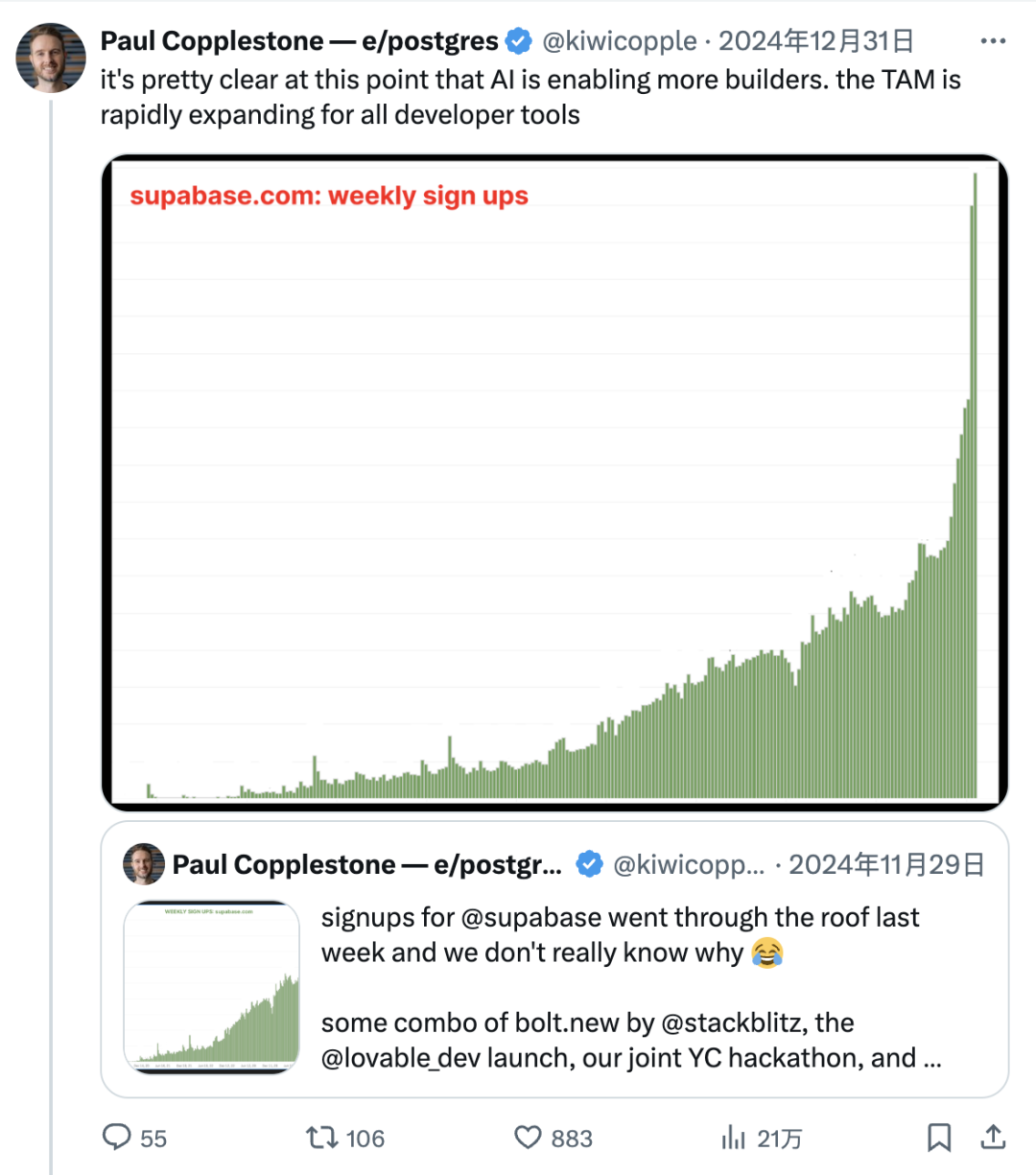 数据库即架构理念有一个非常成功的案例 —— Supabase —— 可能有 80% YC 创业公司都在使用它。Supabase 号称自己是一个 Backend as a Service,将 PostgreSQL,对象存储,以及 EdgeFunction 封装成为一整个运行时,然后将后端与传统意义上的数据库整体打包成为一个 “新的数据库”。