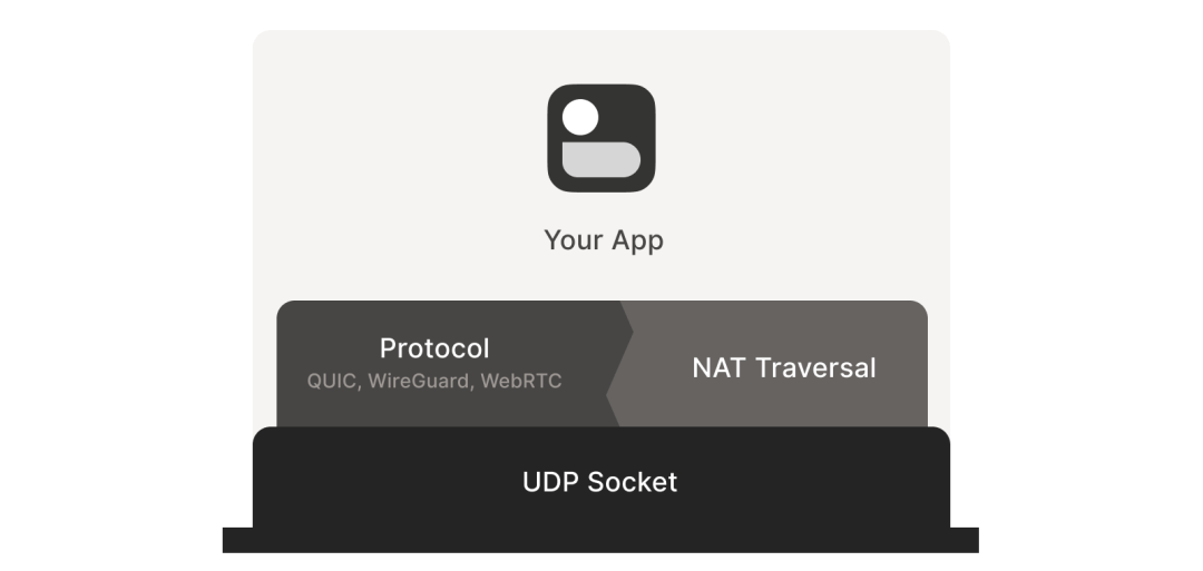 某些协议(例如  WebRTC)将 NAT 穿透与其他部分紧密集成。但如果你在构建自己的协议, 建议将 NAT 穿透作为一个独立实体,与主协议并行运行,二者仅 仅是共享 socket 的关系,如下图所示,这将带来很大帮助: